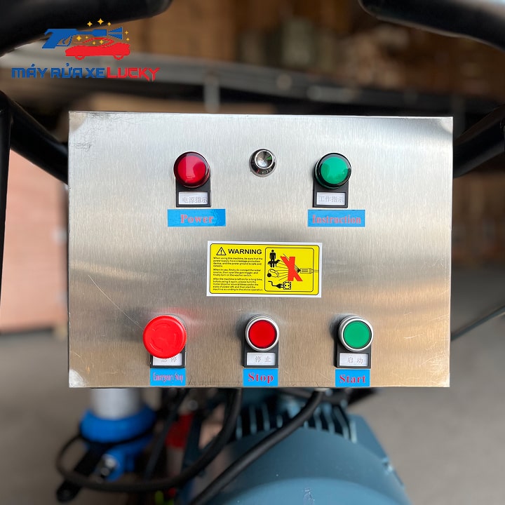 - Nhấn nút Start để khởi động máy: Sau khi kiểm tra đầy đủ, bạn nhấn nút Start (màu xanh ở hàng dưới, bên phải) để kích hoạt mô tơ và bắt đầu vận hành đầu bơm máy rửa xe cao áp 500 bar Lucky.